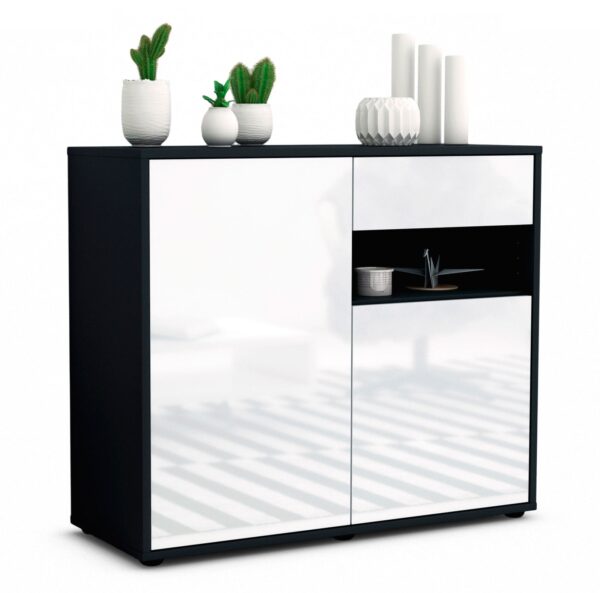 Dieses Sideboard hat Gesamt-Maße von 92x79x35cm. Viel Platz, eine leere Wand, kein passendes Möbelstück? Unsere 92 cm lange Kommode ist die perfekte Lösung! Die Frontfarbe Hochglanz Weiß bringt als reine und unschuldige Farbe Ruhe in jeden Raum. Mit dem Glanz Weiss erzeugt man einen hochwertigen glänzenden Kontrast zu dunklen Wänden. Der anthrazit-matte Korpus harmoniert mit allen Farben und wirkt besonders edel im Kontrast zu hellen Wänden.