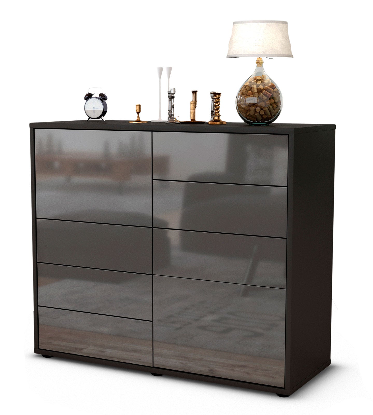 Dieses Sideboard hat Gesamt-Maße von 92x79x35cm. Viel Platz, eine leere Wand, kein passendes Möbelstück? Unsere 92 cm lange Kommode ist die perfekte Lösung! Die Frontfarbe Hochglanz Graphit Grau ist zeitlos, schlicht und daher für jeden Wohnbereich glänzend geeignet. Anthrazit, dunkelgrau oder granit – diese Farbtöne bringen Stil & Glanz. Der anthrazit-matte Korpus harmoniert mit allen Farben und wirkt besonders edel im Kontrast zu hellen Wänden.