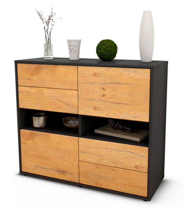 Dieses Sideboard hat Gesamt-Maße von 92x79x35cm. Viel Platz, eine leere Wand, kein passendes Möbelstück? Unsere 92 cm lange Kommode ist die perfekte Lösung! Die Holz Front Eiche Nachbildung überzeugt mit einem warmen, intensiven Braun sowie einer auffälligen Holzmaserung und sorgt mit seiner gelblichen Holzoptik für eine rustikale Gemütlichkeit. Der anthrazit-matte Korpus harmoniert mit allen Farben und wirkt besonders edel im Kontrast zu hellen Wänden.