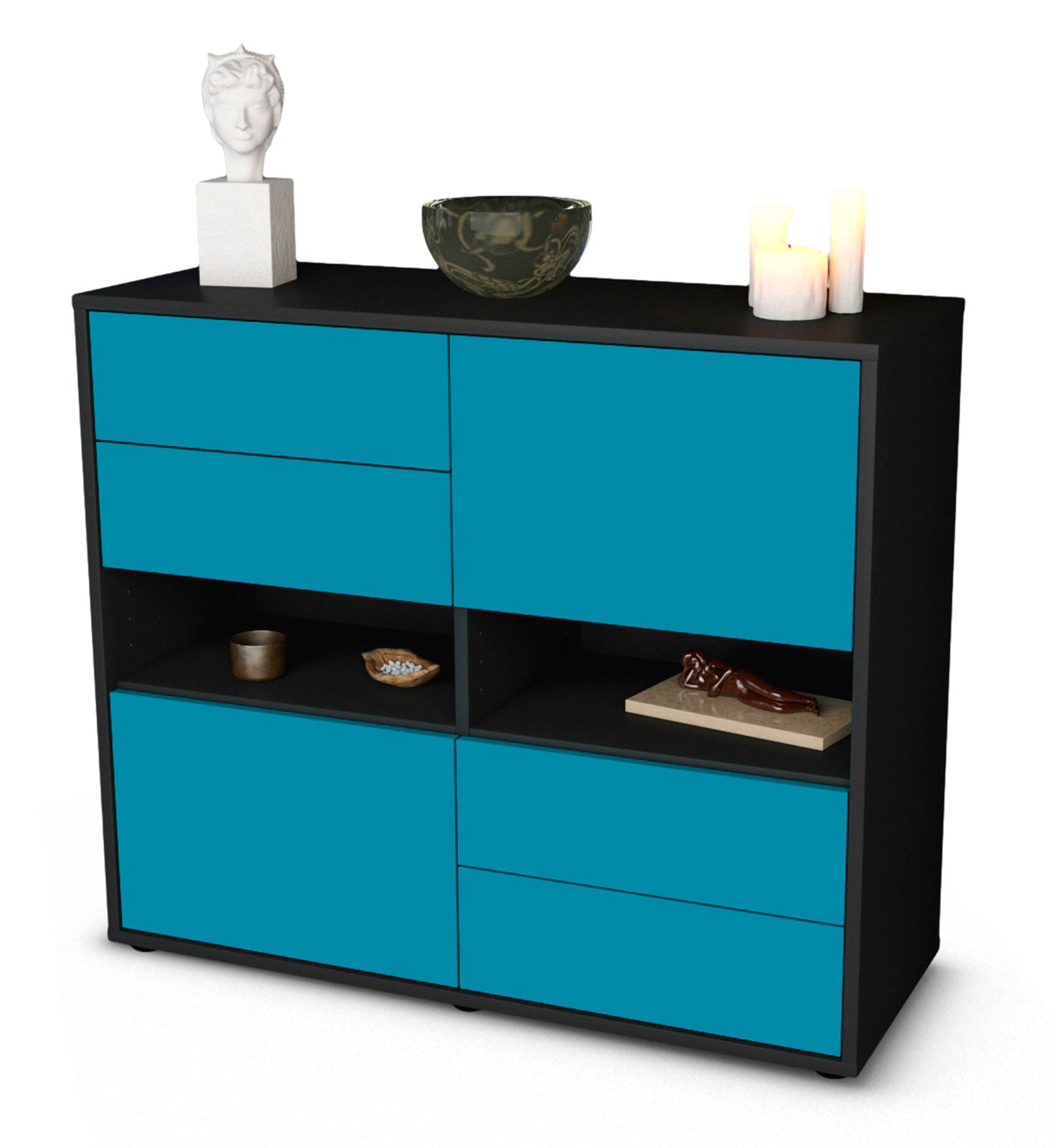 Dieses Sideboard hat Gesamt-Maße von 92x79x35cm. Viel Platz, eine leere Wand, kein passendes Möbelstück? Unsere 92 cm lange Kommode ist die perfekte Lösung! Die Frontfarbe im freundlichen Lagunenblau bringt das schöne Wetter in jedes Zuhause. Das intensive Türkis erinnert an die Karibik und schafft tagtägich einen zusätzlichen Erhoungsfaktor. Der anthrazit-matte Korpus harmoniert mit allen Farben und wirkt besonders edel im Kontrast zu hellen Wänden.