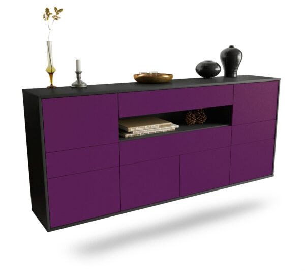 Dieses Sideboard hat Gesamt-Maße von 180x79x35cm. Viel Platz, eine leere Wand, kein passendes Möbelstück? Unsere 1,80 m lange Kommode ist die perfekte Lösung! Die Frontfarbe im kräftigen Aubergine wirkt als Farbtupfer in allen Räumlichkeiten. Lila, violett und Brombeer Töne versprühen Glamour und Eleganz. Der anthrazit-matte Korpus harmoniert mit allen Farben und wirkt besonders edel im Kontrast zu hellen Wänden.