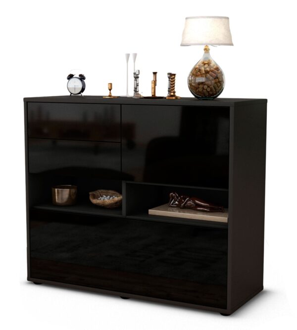 Dieses Sideboard hat Gesamt-Maße von 92x79x35cm. Viel Platz, eine leere Wand, kein passendes Möbelstück? Unsere 92 cm lange Kommode ist die perfekte Lösung! Die Frontfarbe Hochglanz Schwarz ist eine der beliebtesten Möbelfarben. Glanz Dekore sind hoch modern und liegen immer im Trend. Die Front ist glänzend und und leicht spiegelnd. Der anthrazit-matte Korpus harmoniert mit allen Farben und wirkt besonders edel im Kontrast zu hellen Wänden.