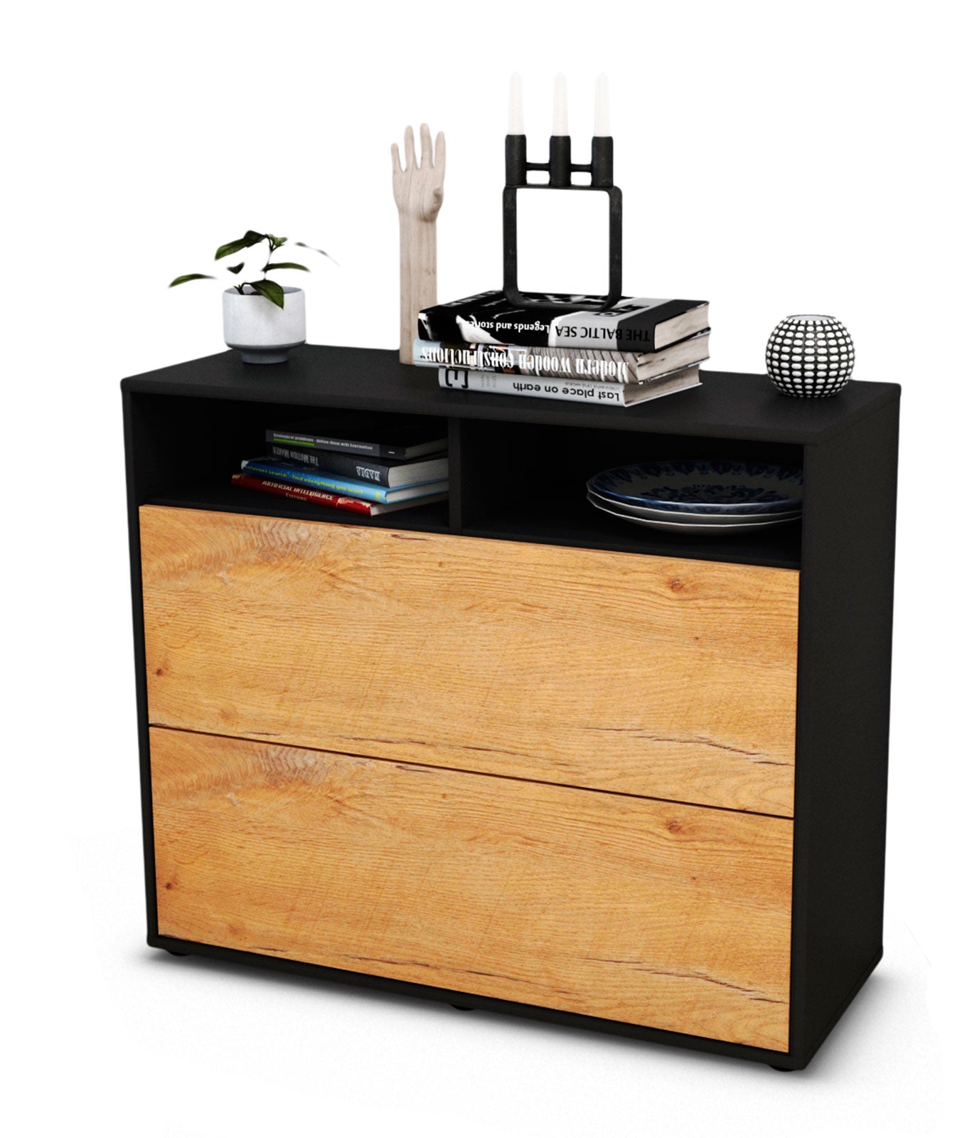 Dieses Sideboard hat Gesamt-Maße von 92x79x35cm. Viel Platz, eine leere Wand, kein passendes Möbelstück? Unsere 92 cm lange Kommode ist die perfekte Lösung! Die Holz Front Eiche Nachbildung überzeugt mit einem warmen, intensiven Braun sowie einer auffälligen Holzmaserung und sorgt mit seiner gelblichen Holzoptik für eine rustikale Gemütlichkeit. Der anthrazit-matte Korpus harmoniert mit allen Farben und wirkt besonders edel im Kontrast zu hellen Wänden.