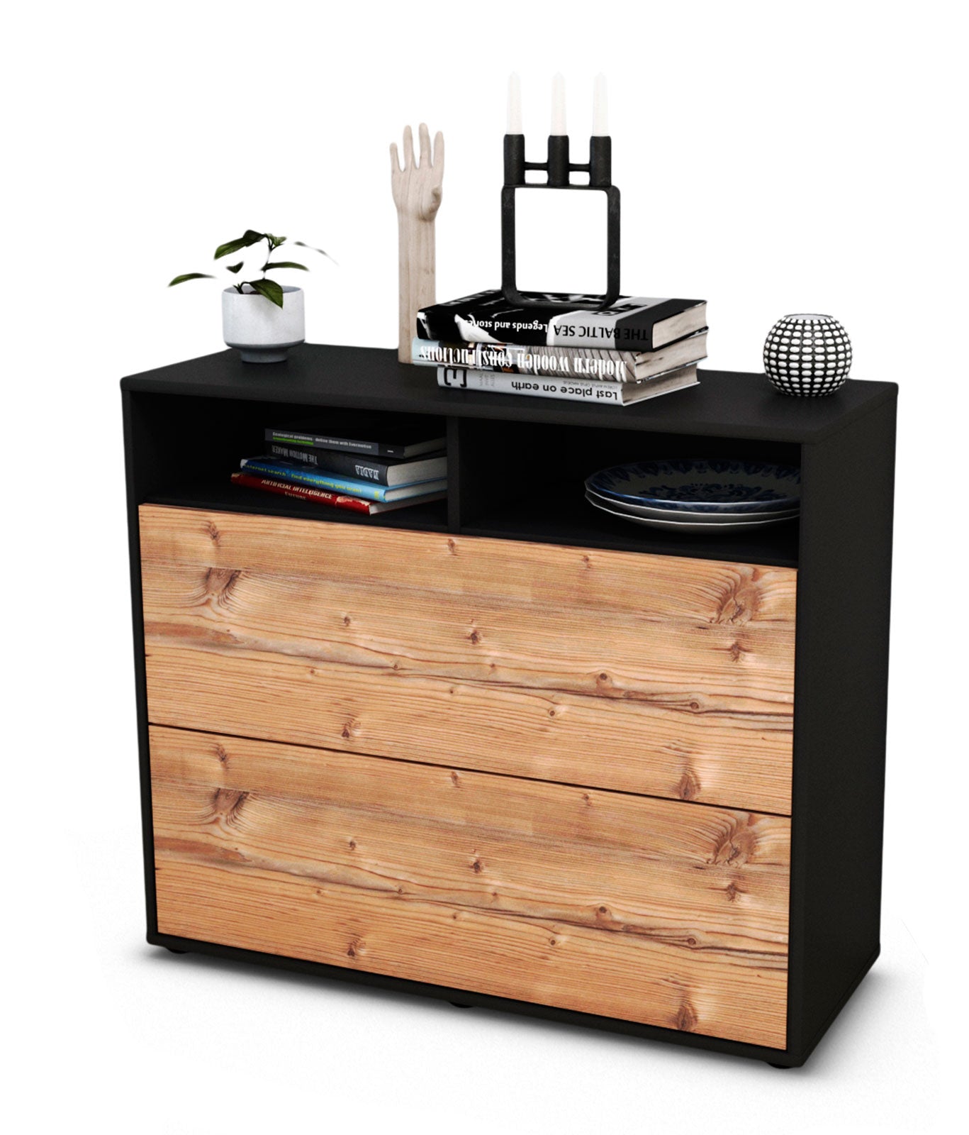 Dieses Sideboard hat Gesamt-Maße von 92x79x35cm. Viel Platz, eine leere Wand, kein passendes Möbelstück? Unsere 92 cm lange Kommode ist die perfekte Lösung! Die Holz Front Pinie Nachbildung ist ein freundliches Braun mit farblich abgesetzter Holzmaserung. Die Integrierung in Wohnräume ist durch das warme Holz leicht möglich. Der anthrazit-matte Korpus harmoniert mit allen Farben und wirkt besonders edel im Kontrast zu hellen Wänden.