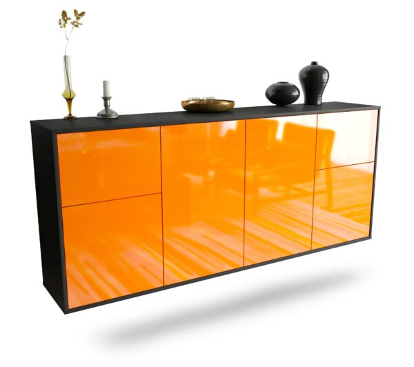 Dieses Sideboard hat Gesamt-Maße von 180x79x35cm. Viel Platz, eine leere Wand, kein passendes Möbelstück? Unsere 1,80 m lange Kommode ist die perfekte Lösung! Die Frontfarbe Hochglanz Mandarine überzeugt durch ein intensives Orange mit tollem Glanz. Fröhlich und gläzend wird diese Farbe jeden Raum für sich einehmen. Der anthrazit-matte Korpus harmoniert mit allen Farben und wirkt besonders edel im Kontrast zu hellen Wänden.