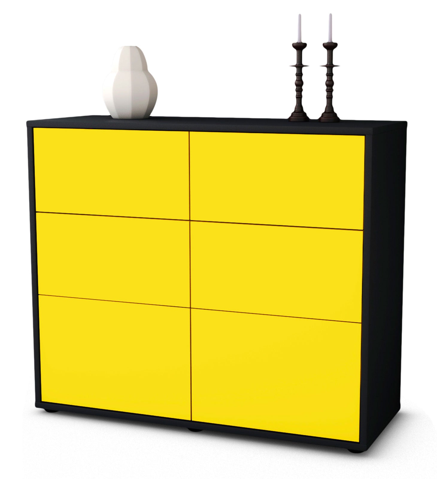 Dieses Sideboard hat Gesamt-Maße von 92x79x35cm. Viel Platz, eine leere Wand, kein passendes Möbelstück? Unsere 92 cm lange Kommode ist die perfekte Lösung! Die Frontfarbe Sonnengelb verleiht Räumen Freude und positive Energie ohne diesen farblich zu überfluten. Der eher gelb pastell Ton verschafft eine frische Atmosphäre.Der anthrazit-matte Korpus harmoniert mit allen Farben und wirkt besonders edel im Kontrast zu hellen Wänden.