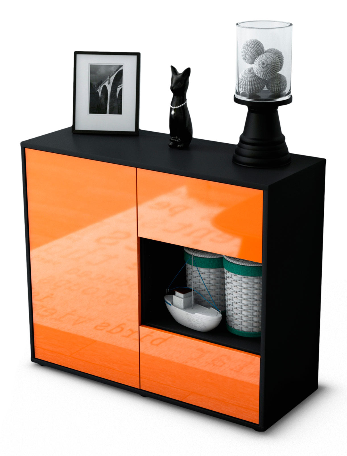 Dieses Sideboard hat Gesamt-Maße von 92x79x35cm. Viel Platz, eine leere Wand, kein passendes Möbelstück? Unsere 92 cm lange Kommode ist die perfekte Lösung! Die Frontfarbe Hochglanz Mandarine überzeugt durch ein intensives Orange mit tollem Glanz. Fröhlich und gläzend wird diese Farbe jeden Raum für sich einehmen. Der anthrazit-matte Korpus harmoniert mit allen Farben und wirkt besonders edel im Kontrast zu hellen Wänden.