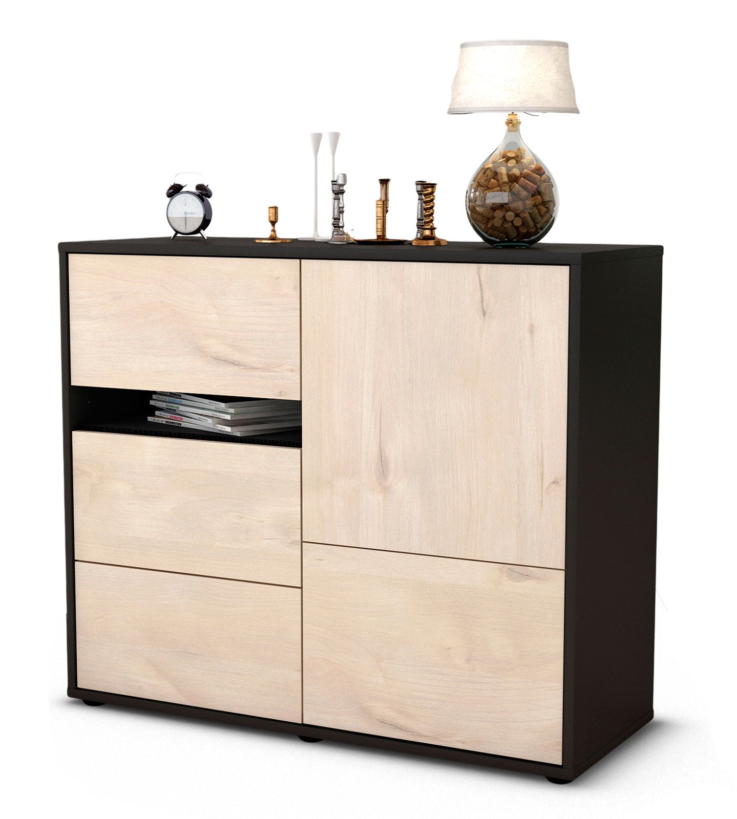 Dieses Sideboard hat Gesamt-Maße von 92x79x35cm. Viel Platz, eine leere Wand, kein passendes Möbelstück? Unsere 92 cm lange Kommode ist die perfekte Lösung! Die Holz Front Zeder Nachbildung ist ein Holz Dekor welches sehr hell und mit einer dezenten Holzmaserung punktet. Durch das frische Dekor ist der Schrank ideal für alle Räume geeignet. Der anthrazit-matte Korpus harmoniert mit allen Farben und wirkt besonders edel im Kontrast zu hellen Wänden.