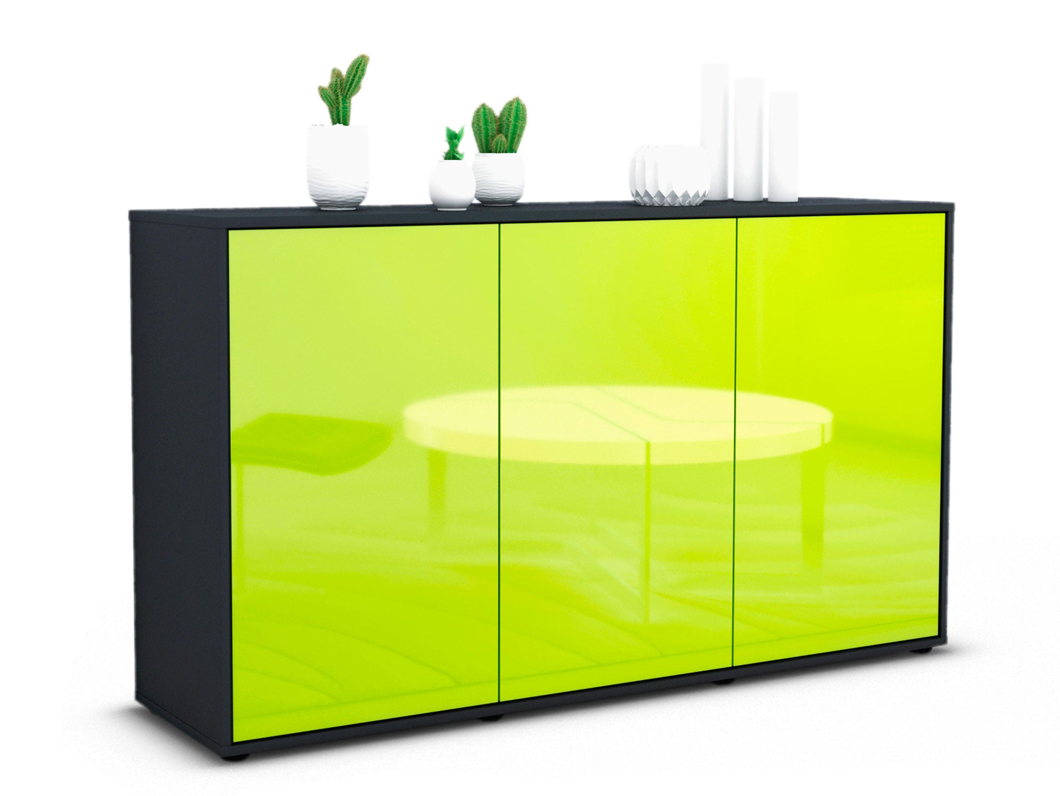 Dieses Sideboard hat Gesamt-Maße von 136x79x35cm. Viel Platz, eine leere Wand, kein passendes Möbelstück? Unsere 1,36 m lange Kommode ist die perfekte Lösung! Die Frontfarbe Hochglanz Limettengrün bringt Schwung, Glanz und Farbe in jede Wohnung. Das knallig, leuchtende grün ist glänzend und wirkt wie ein frisches Apfelgrün oder eine saftige Limette. Der anthrazit-matte Korpus harmoniert mit allen Farben und wirkt besonders edel im Kontrast zu hellen Wänden.