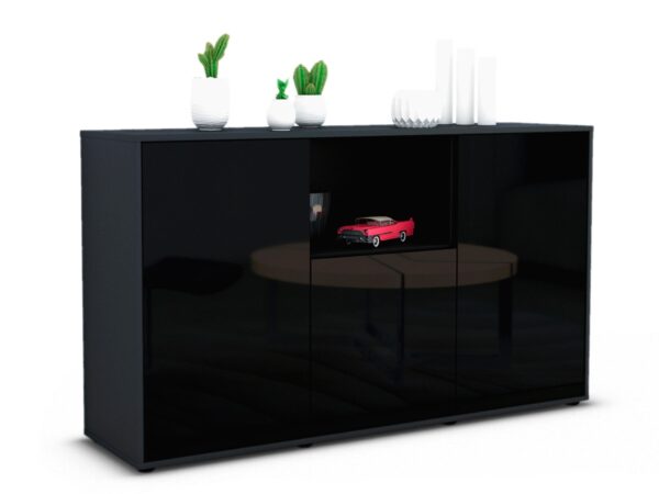 Dieses Sideboard hat Gesamt-Maße von 136x79x35cm. Viel Platz, eine leere Wand, kein passendes Möbelstück? Unsere 1,36 m lange Kommode ist die perfekte Lösung! Die Frontfarbe Hochglanz Schwarz ist eine der beliebtesten Möbelfarben. Glanz Dekore sind hoch modern und liegen immer im Trend. Die Front ist glänzend und und leicht spiegelnd. Der anthrazit-matte Korpus harmoniert mit allen Farben und wirkt besonders edel im Kontrast zu hellen Wänden.