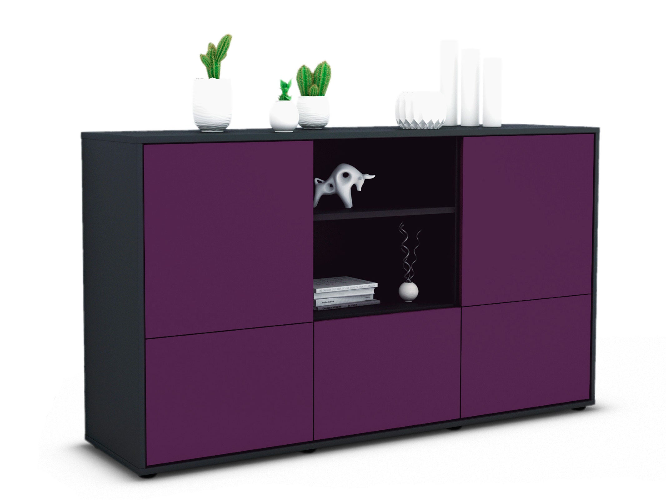 Dieses Sideboard hat Gesamt-Maße von 136x79x35cm. Viel Platz, eine leere Wand, kein passendes Möbelstück? Unsere 1,36 m lange Kommode ist die perfekte Lösung! Die Frontfarbe im kräftigen Aubergine wirkt als Farbtupfer in allen Räumlichkeiten. Lila, violett und Brombeer Töne versprühen Glamour und Eleganz. Der anthrazit-matte Korpus harmoniert mit allen Farben und wirkt besonders edel im Kontrast zu hellen Wänden.