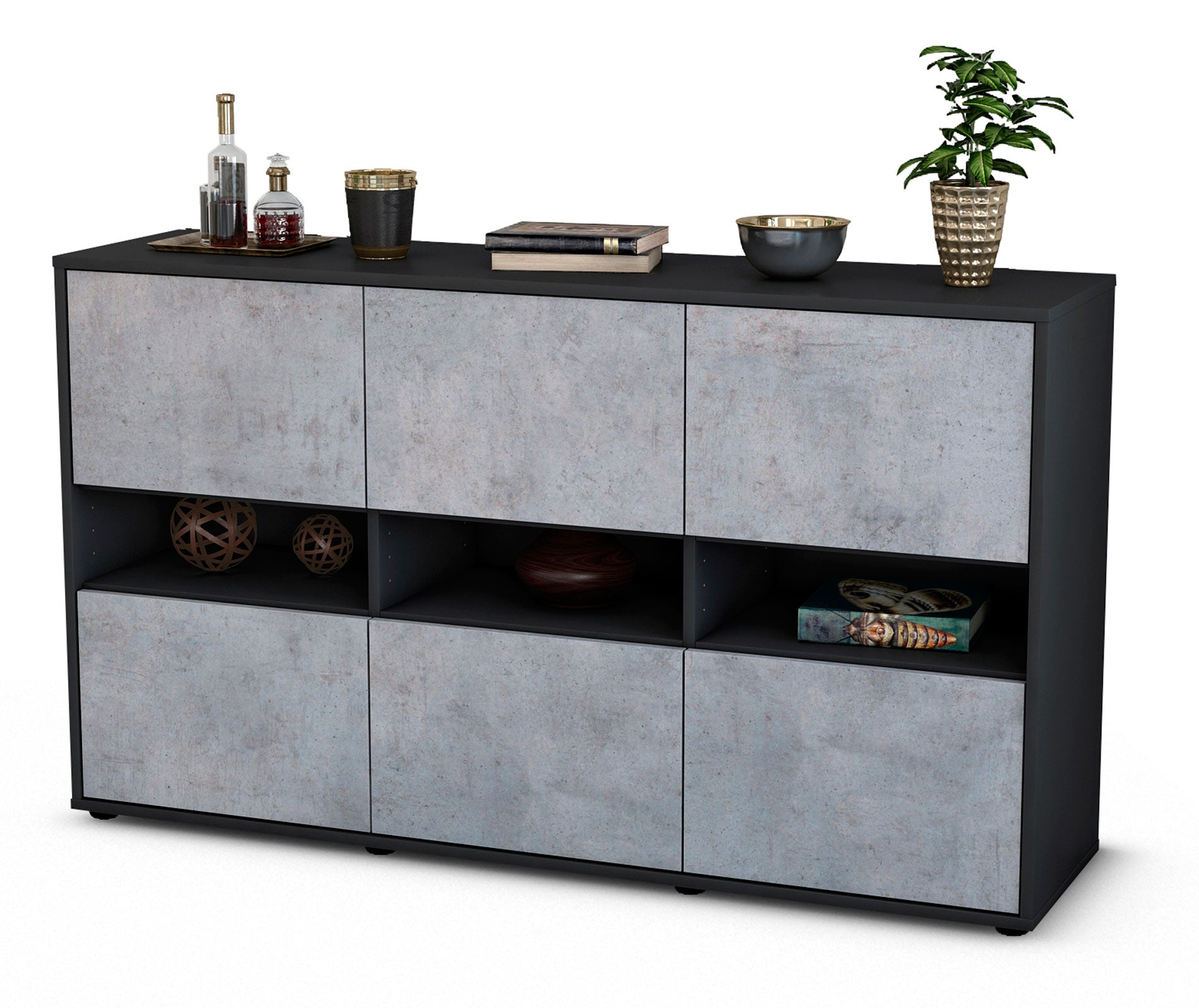 Dieses Sideboard hat Gesamt-Maße von 136x79x35cm. Viel Platz, eine leere Wand, kein passendes Möbelstück? Unsere 1,36 m lange Kommode ist die perfekte Lösung! Die Frontfarbe Beton wirkt zeitlos und hoch modern. Die steinähnliche Nachbildung zeigt sich als klassisch, stilvolles Grau meliert. Die Betonoptik im Industrie-Look liegt gerade voll im Trend. Der anthrazit-matte Korpus harmoniert mit allen Farben und wirkt besonders edel im Kontrast zu hellen Wänden.