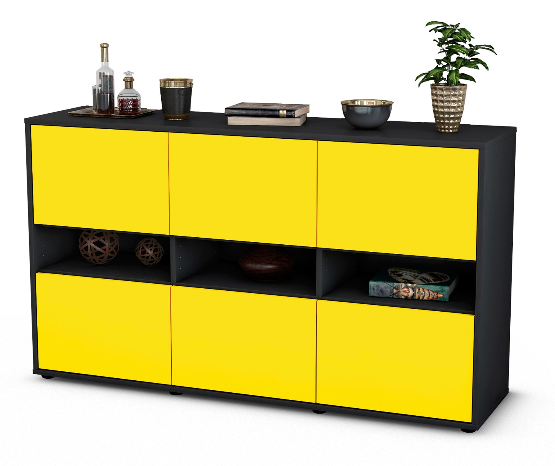 Dieses Sideboard hat Gesamt-Maße von 136x79x35cm. Viel Platz, eine leere Wand, kein passendes Möbelstück? Unsere 1,36 m lange Kommode ist die perfekte Lösung! Die Frontfarbe Sonnengelb verleiht Räumen Freude und positive Energie ohne diesen farblich zu überfluten. Der eher gelb pastell Ton verschafft eine frische Atmosphäre.Der anthrazit-matte Korpus harmoniert mit allen Farben und wirkt besonders edel im Kontrast zu hellen Wänden.