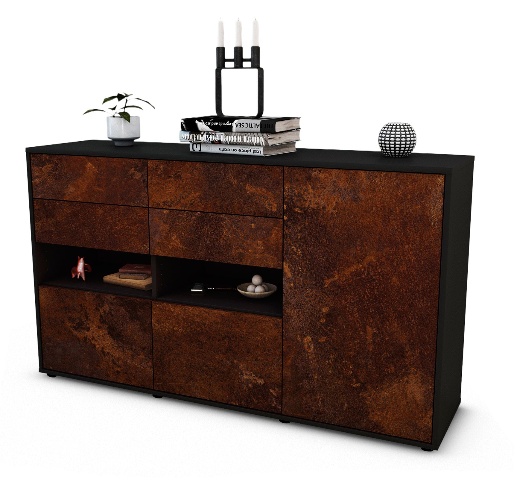 Dieses Sideboard hat Gesamt-Maße von 136x79x35cm. Viel Platz, eine leere Wand, kein passendes Möbelstück? Unsere 1,36 m lange Kommode ist die perfekte Lösung! Die Frontfarbe Rost wirkt antik und verleiht einen Retro Industrie-Look. Die Darstellung von alten, verwitterten oder verrosteten Metall / Eisen wirkt Rot-Braun bzw. Bronze-Farben. Der anthrazit-matte Korpus harmoniert mit allen Farben und wirkt besonders edel im Kontrast zu hellen Wänden.