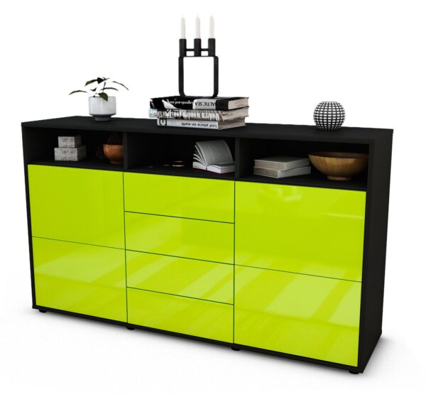 Dieses Sideboard hat Gesamt-Maße von 136x79x35cm. Viel Platz, eine leere Wand, kein passendes Möbelstück? Unsere 1,36 m lange Kommode ist die perfekte Lösung! Die Frontfarbe Hochglanz Limettengrün bringt Schwung, Glanz und Farbe in jede Wohnung. Das knallig, leuchtende grün ist glänzend und wirkt wie ein frisches Apfelgrün oder eine saftige Limette. Der anthrazit-matte Korpus harmoniert mit allen Farben und wirkt besonders edel im Kontrast zu hellen Wänden.