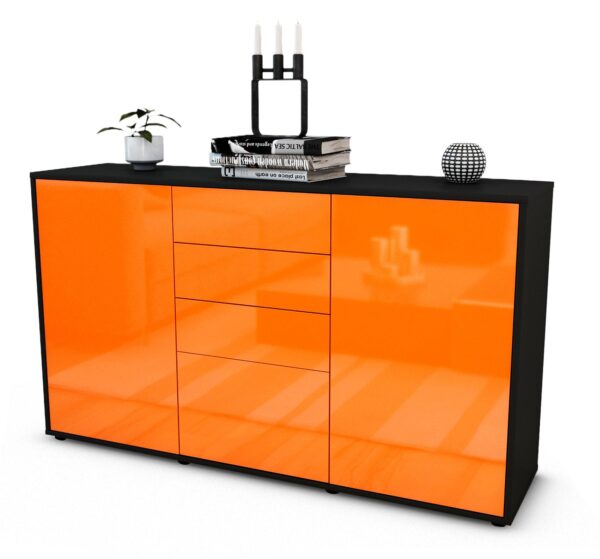 Dieses Sideboard hat Gesamt-Maße von 136x79x35cm. Viel Platz, eine leere Wand, kein passendes Möbelstück? Unsere 1,36 m lange Kommode ist die perfekte Lösung! Die Frontfarbe Hochglanz Mandarine überzeugt durch ein intensives Orange mit tollem Glanz. Fröhlich und gläzend wird diese Farbe jeden Raum für sich einehmen. Der anthrazit-matte Korpus harmoniert mit allen Farben und wirkt besonders edel im Kontrast zu hellen Wänden.