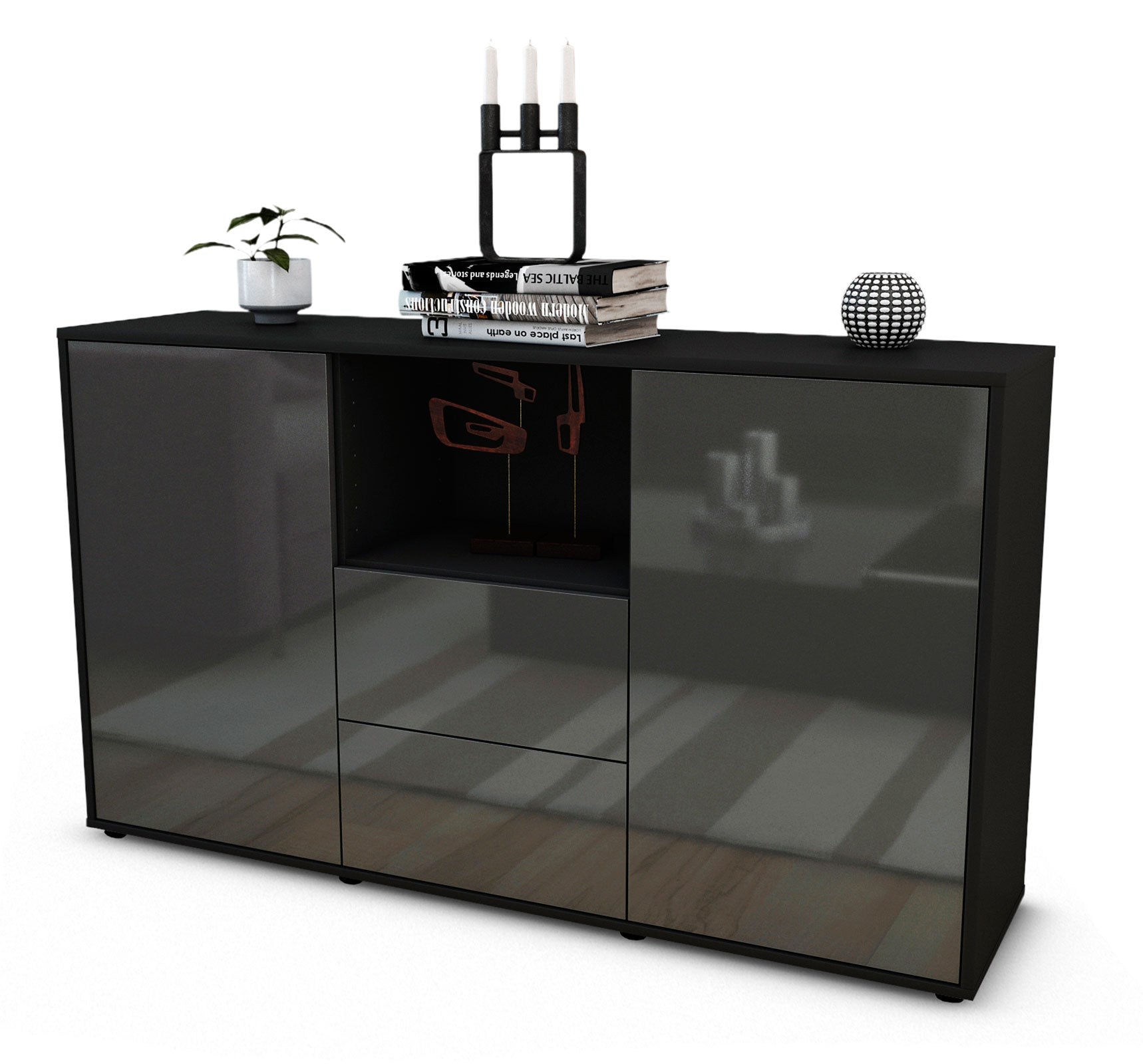Dieses Sideboard hat Gesamt-Maße von 136x79x35cm. Viel Platz, eine leere Wand, kein passendes Möbelstück? Unsere 1,36 m lange Kommode ist die perfekte Lösung! Die Frontfarbe Hochglanz Graphit Grau ist zeitlos, schlicht und daher für jeden Wohnbereich glänzend geeignet. Anthrazit, dunkelgrau oder granit – diese Farbtöne bringen Stil & Glanz. Der anthrazit-matte Korpus harmoniert mit allen Farben und wirkt besonders edel im Kontrast zu hellen Wänden.