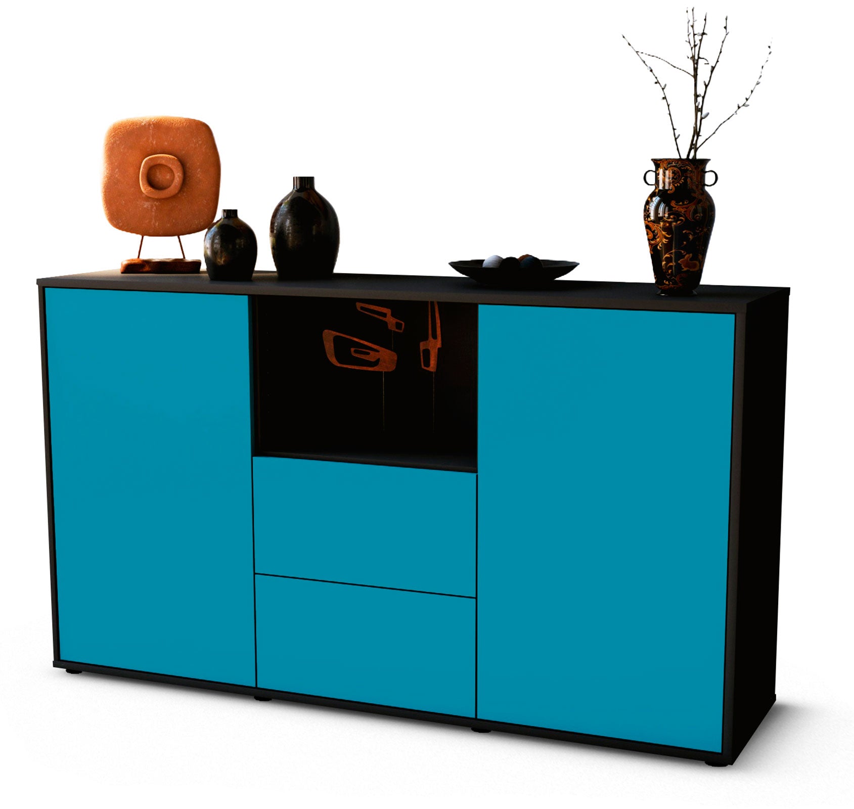 Dieses Sideboard hat Gesamt-Maße von 136x79x35cm. Viel Platz, eine leere Wand, kein passendes Möbelstück? Unsere 1,36 m lange Kommode ist die perfekte Lösung! Die Frontfarbe im freundlichen Lagunenblau bringt das schöne Wetter in jedes Zuhause. Das intensive Türkis erinnert an die Karibik und schafft tagtägich einen zusätzlichen Erhoungsfaktor. Der anthrazit-matte Korpus harmoniert mit allen Farben und wirkt besonders edel im Kontrast zu hellen Wänden.