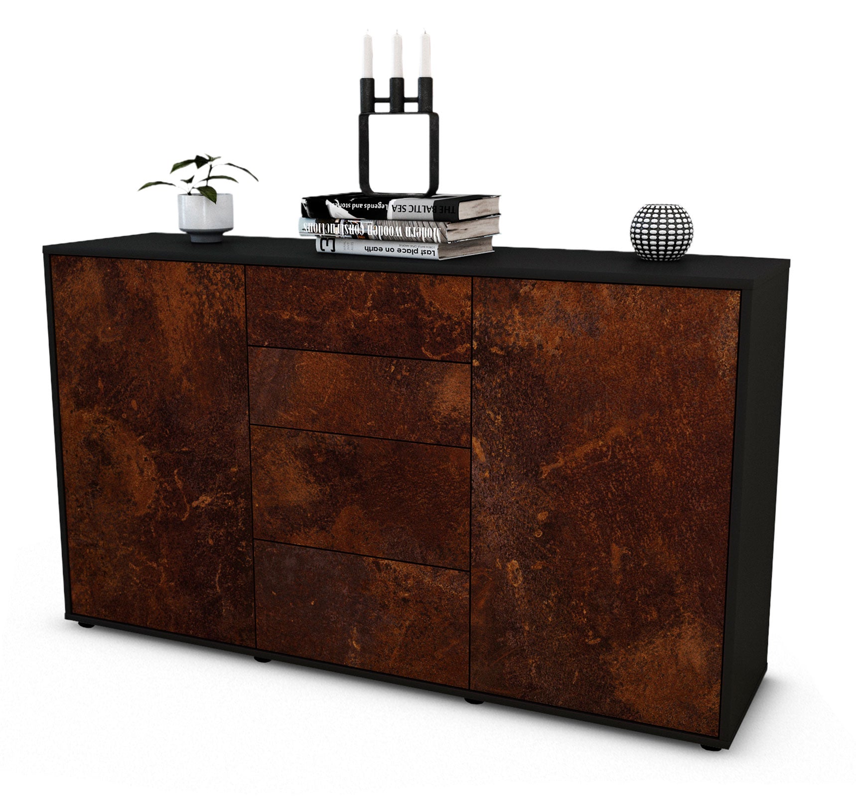 Dieses Sideboard hat Gesamt-Maße von 136x79x35cm. Viel Platz, eine leere Wand, kein passendes Möbelstück? Unsere 1,36 m lange Kommode ist die perfekte Lösung! Die Frontfarbe Rost wirkt antik und verleiht einen Retro Industrie-Look. Die Darstellung von alten, verwitterten oder verrosteten Metall / Eisen wirkt Rot-Braun bzw. Bronze-Farben. Der anthrazit-matte Korpus harmoniert mit allen Farben und wirkt besonders edel im Kontrast zu hellen Wänden.