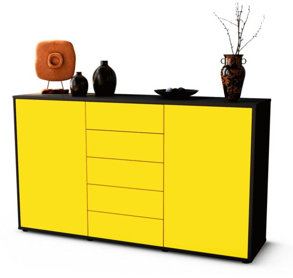 Dieses Sideboard hat Gesamt-Maße von 136x79x35cm. Viel Platz, eine leere Wand, kein passendes Möbelstück? Unsere 1,36 m lange Kommode ist die perfekte Lösung! Die Frontfarbe Sonnengelb verleiht Räumen Freude und positive Energie ohne diesen farblich zu überfluten. Der eher gelb pastell Ton verschafft eine frische Atmosphäre.Der anthrazit-matte Korpus harmoniert mit allen Farben und wirkt besonders edel im Kontrast zu hellen Wänden.