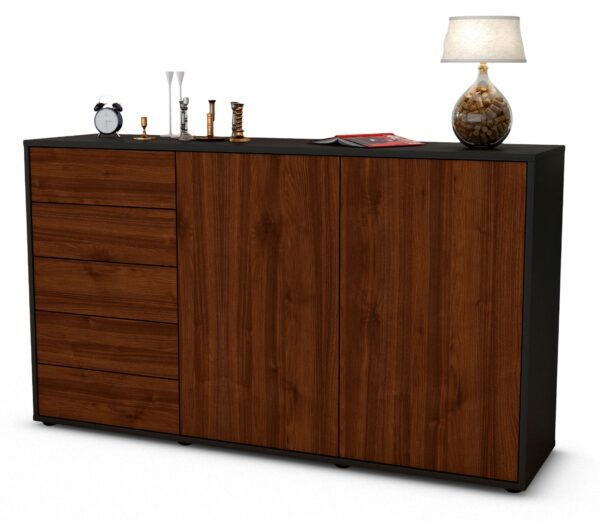 Dieses Sideboard hat Gesamt-Maße von 136x79x35cm. Viel Platz, eine leere Wand, kein passendes Möbelstück? Unsere 1,36 m lange Kommode ist die perfekte Lösung! Die Holz Front Walnuss Nachbildung wirkt mit einem dunklen und intensiven Braun sehr einladend. Das dunkel erscheinende Holz passt sehr gut zu einem gemütlichen Einrichtungsstil. Der anthrazit-matte Korpus harmoniert mit allen Farben und wirkt besonders edel im Kontrast zu hellen Wänden.