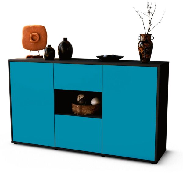 Dieses Sideboard hat Gesamt-Maße von 136x79x35cm. Viel Platz, eine leere Wand, kein passendes Möbelstück? Unsere 1,36 m lange Kommode ist die perfekte Lösung! Die Frontfarbe im freundlichen Lagunenblau bringt das schöne Wetter in jedes Zuhause. Das intensive Türkis erinnert an die Karibik und schafft tagtägich einen zusätzlichen Erhoungsfaktor. Der anthrazit-matte Korpus harmoniert mit allen Farben und wirkt besonders edel im Kontrast zu hellen Wänden.