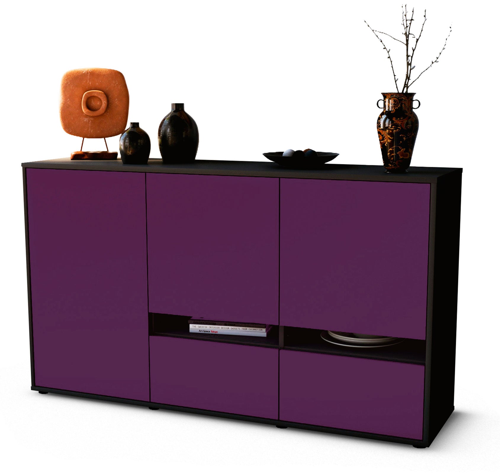 Dieses Sideboard hat Gesamt-Maße von 136x79x35cm. Viel Platz, eine leere Wand, kein passendes Möbelstück? Unsere 1,36 m lange Kommode ist die perfekte Lösung! Die Frontfarbe im kräftigen Aubergine wirkt als Farbtupfer in allen Räumlichkeiten. Lila, violett und Brombeer Töne versprühen Glamour und Eleganz. Der anthrazit-matte Korpus harmoniert mit allen Farben und wirkt besonders edel im Kontrast zu hellen Wänden.