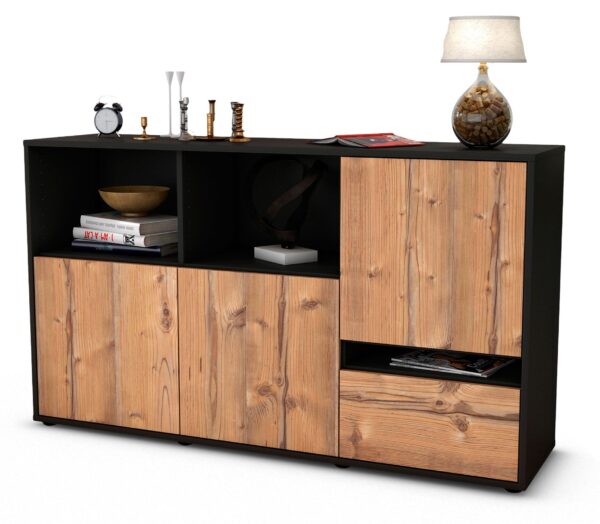 Dieses Sideboard hat Gesamt-Maße von 136x79x35cm. Viel Platz, eine leere Wand, kein passendes Möbelstück? Unsere 1,36 m lange Kommode ist die perfekte Lösung! Die Holz Front Pinie Nachbildung ist ein freundliches Braun mit farblich abgesetzter Holzmaserung. Die Integrierung in Wohnräume ist durch das warme Holz leicht möglich. Der anthrazit-matte Korpus harmoniert mit allen Farben und wirkt besonders edel im Kontrast zu hellen Wänden.