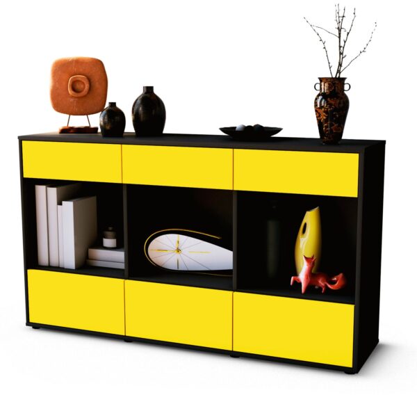 Dieses Sideboard hat Gesamt-Maße von 136x79x35cm. Viel Platz, eine leere Wand, kein passendes Möbelstück? Unsere 1,36 m lange Kommode ist die perfekte Lösung! Die Frontfarbe Sonnengelb verleiht Räumen Freude und positive Energie ohne diesen farblich zu überfluten. Der eher gelb pastell Ton verschafft eine frische Atmosphäre.Der anthrazit-matte Korpus harmoniert mit allen Farben und wirkt besonders edel im Kontrast zu hellen Wänden.