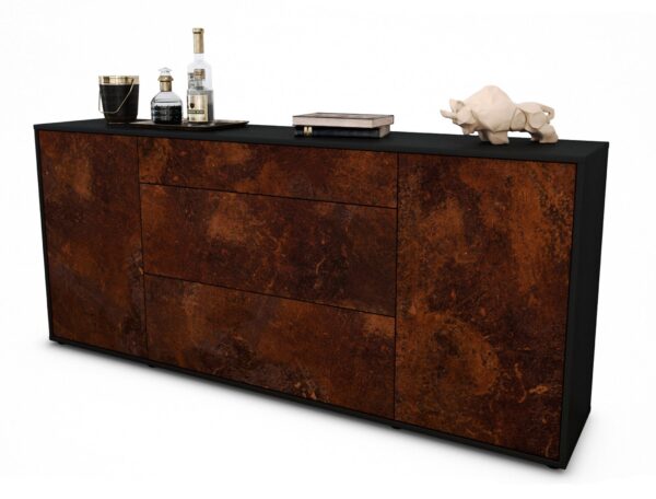 Dieses Sideboard hat Gesamt-Maße von 180x79x35cm. Viel Platz, eine leere Wand, kein passendes Möbelstück? Unsere 1,80 m lange Kommode ist die perfekte Lösung! Die Frontfarbe Rost wirkt antik und verleiht einen Retro Industrie-Look. Die Darstellung von alten, verwitterten oder verrosteten Metall / Eisen wirkt Rot-Braun bzw. Bronze-Farben. Der anthrazit-matte Korpus harmoniert mit allen Farben und wirkt besonders edel im Kontrast zu hellen Wänden.