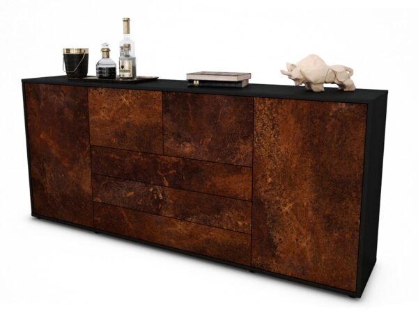Dieses Sideboard hat Gesamt-Maße von 180x79x35cm. Viel Platz, eine leere Wand, kein passendes Möbelstück? Unsere 1,80 m lange Kommode ist die perfekte Lösung! Die Frontfarbe Rost wirkt antik und verleiht einen Retro Industrie-Look. Die Darstellung von alten, verwitterten oder verrosteten Metall / Eisen wirkt Rot-Braun bzw. Bronze-Farben. Der anthrazit-matte Korpus harmoniert mit allen Farben und wirkt besonders edel im Kontrast zu hellen Wänden.