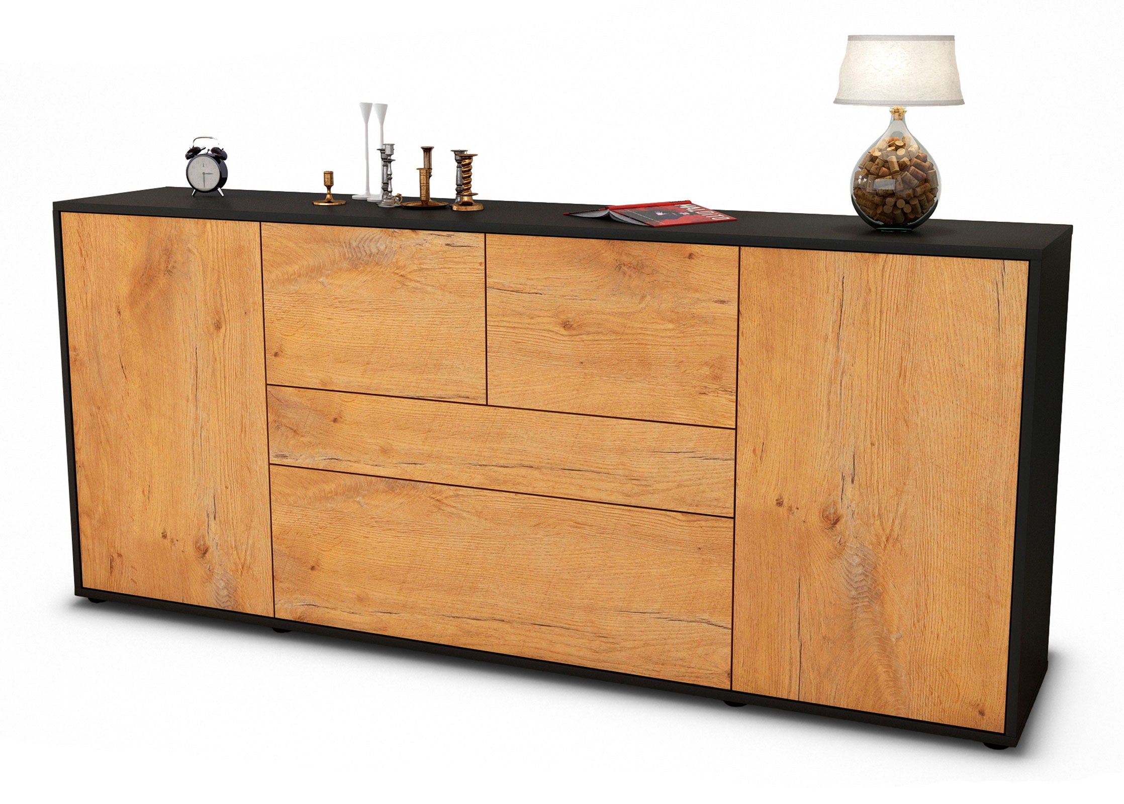 Dieses Sideboard hat Gesamt-Maße von 180x79x35cm. Viel Platz, eine leere Wand, kein passendes Möbelstück? Unsere 1,80 m lange Kommode ist die perfekte Lösung! Die Holz Front Eiche Nachbildung überzeugt mit einem warmen, intensiven Braun sowie einer auffälligen Holzmaserung und sorgt mit seiner gelblichen Holzoptik für eine rustikale Gemütlichkeit. Der anthrazit-matte Korpus harmoniert mit allen Farben und wirkt besonders edel im Kontrast zu hellen Wänden.