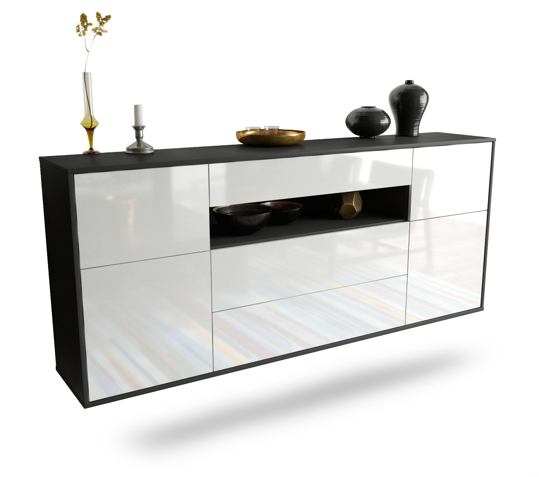 Dieses Sideboard hat Gesamt-Maße von 180x79x35cm. Viel Platz, eine leere Wand, kein passendes Möbelstück? Unsere 1,80 m lange Kommode ist die perfekte Lösung! Die Frontfarbe Hochglanz Weiß bringt als reine und unschuldige Farbe Ruhe in jeden Raum. Mit dem Glanz Weiss erzeugt man einen hochwertigen glänzenden Kontrast zu dunklen Wänden. Der anthrazit-matte Korpus harmoniert mit allen Farben und wirkt besonders edel im Kontrast zu hellen Wänden.