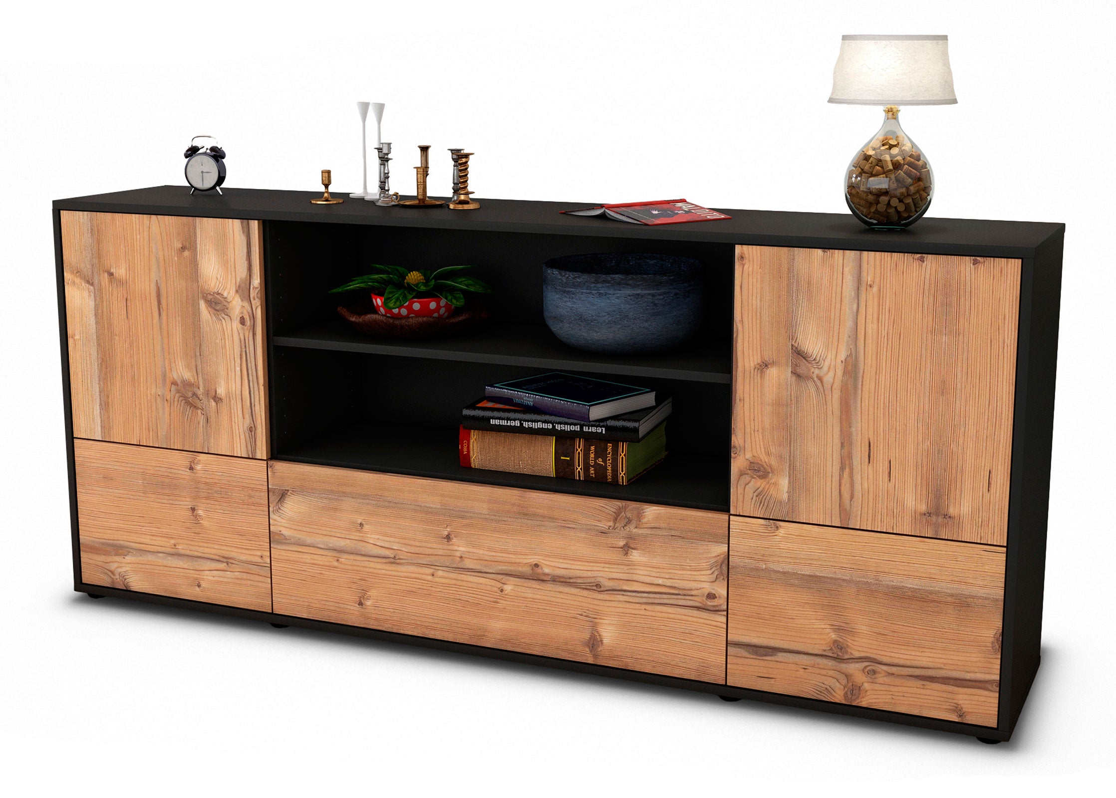 Dieses Sideboard hat Gesamt-Maße von 180x79x35cm. Viel Platz, eine leere Wand, kein passendes Möbelstück? Unsere 1,80 m lange Kommode ist die perfekte Lösung! Die Holz Front Pinie Nachbildung ist ein freundliches Braun mit farblich abgesetzter Holzmaserung. Die Integrierung in Wohnräume ist durch das warme Holz leicht möglich. Der anthrazit-matte Korpus harmoniert mit allen Farben und wirkt besonders edel im Kontrast zu hellen Wänden.