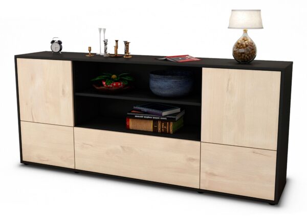 Dieses Sideboard hat Gesamt-Maße von 180x79x35cm. Viel Platz, eine leere Wand, kein passendes Möbelstück? Unsere 1,80 m lange Kommode ist die perfekte Lösung! Die Holz Front Zeder Nachbildung ist ein Holz Dekor welches sehr hell und mit einer dezenten Holzmaserung punktet. Durch das frische Dekor ist der Schrank ideal für alle Räume geeignet. Der anthrazit-matte Korpus harmoniert mit allen Farben und wirkt besonders edel im Kontrast zu hellen Wänden.