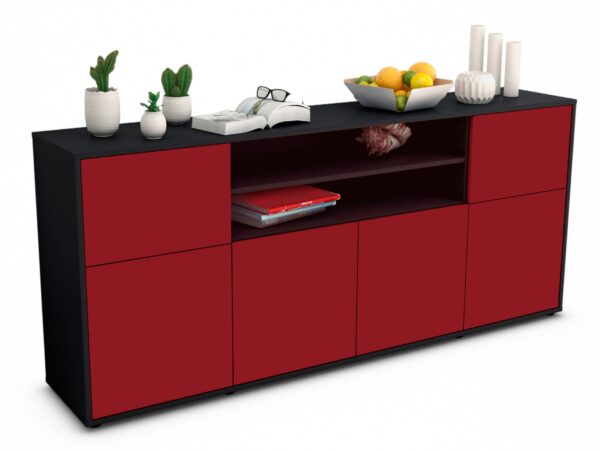 Dieses Sideboard hat Gesamt-Maße von 180x79x35cm. Viel Platz, eine leere Wand, kein passendes Möbelstück? Unsere 1,80 m lange Kommode ist die perfekte Lösung! Die Frontfarbe dunkles Bordeaux Rot bringt Wärme ins Haus. Das intensive Weinrot ist einer der edelsten Rot Töne und verleiht jeder Einrichtung einen Glamour Faktor.Der anthrazit-matte Korpus harmoniert mit allen Farben und wirkt besonders edel im Kontrast zu hellen Wänden.