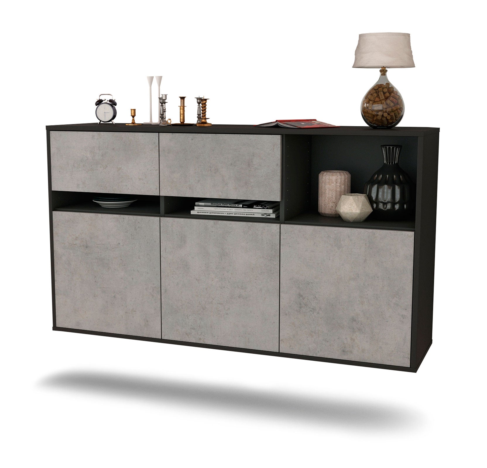 Dieses Sideboard hat Gesamt-Maße von 136x79x35cm. Viel Platz, eine leere Wand, kein passendes Möbelstück? Unsere 1,36 m lange Kommode ist die perfekte Lösung! Die Frontfarbe Beton wirkt zeitlos und hoch modern. Die steinähnliche Nachbildung zeigt sich als klassisch, stilvolles Grau meliert. Die Betonoptik im Industrie-Look liegt gerade voll im Trend. Der anthrazit-matte Korpus harmoniert mit allen Farben und wirkt besonders edel im Kontrast zu hellen Wänden.