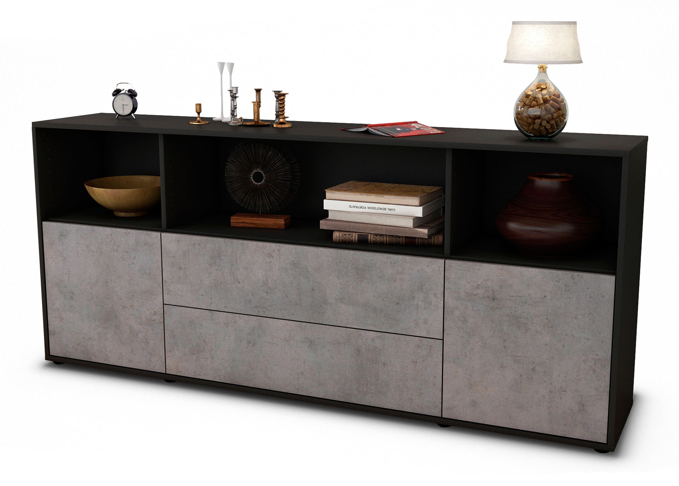 Dieses Sideboard hat Gesamt-Maße von 180x79x35cm. Viel Platz, eine leere Wand, kein passendes Möbelstück? Unsere 1,80 m lange Kommode ist die perfekte Lösung! Die Frontfarbe Beton wirkt zeitlos und hoch modern. Die steinähnliche Nachbildung zeigt sich als klassisch, stilvolles Grau meliert. Die Betonoptik im Industrie-Look liegt gerade voll im Trend. Der anthrazit-matte Korpus harmoniert mit allen Farben und wirkt besonders edel im Kontrast zu hellen Wänden.