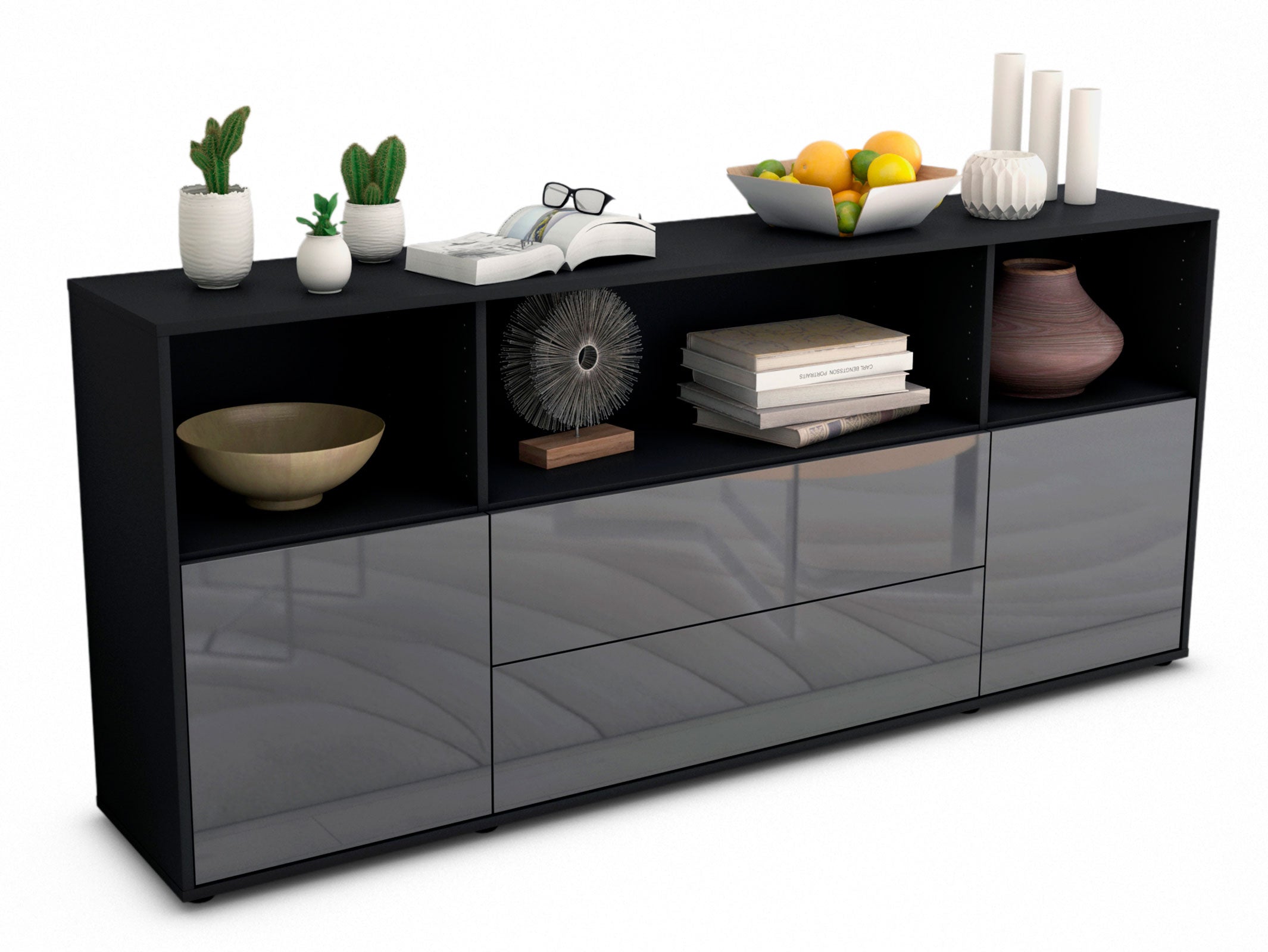 Dieses Sideboard hat Gesamt-Maße von 180x79x35cm. Viel Platz, eine leere Wand, kein passendes Möbelstück? Unsere 1,80 m lange Kommode ist die perfekte Lösung! Die Frontfarbe Hochglanz Graphit Grau ist zeitlos, schlicht und daher für jeden Wohnbereich glänzend geeignet. Anthrazit, dunkelgrau oder granit – diese Farbtöne bringen Stil & Glanz. Der anthrazit-matte Korpus harmoniert mit allen Farben und wirkt besonders edel im Kontrast zu hellen Wänden.