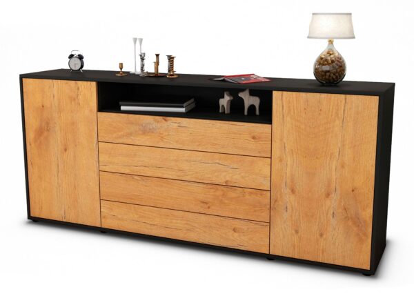 Dieses Sideboard hat Gesamt-Maße von 180x79x35cm. Viel Platz, eine leere Wand, kein passendes Möbelstück? Unsere 1,80 m lange Kommode ist die perfekte Lösung! Die Holz Front Eiche Nachbildung überzeugt mit einem warmen, intensiven Braun sowie einer auffälligen Holzmaserung und sorgt mit seiner gelblichen Holzoptik für eine rustikale Gemütlichkeit. Der anthrazit-matte Korpus harmoniert mit allen Farben und wirkt besonders edel im Kontrast zu hellen Wänden.