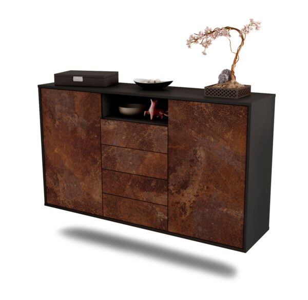 Dieses Sideboard hat Gesamt-Maße von 136x79x35cm. Viel Platz, eine leere Wand, kein passendes Möbelstück? Unsere 1,36 m lange Kommode ist die perfekte Lösung! Die Frontfarbe Rost wirkt antik und verleiht einen Retro Industrie-Look. Die Darstellung von alten, verwitterten oder verrosteten Metall / Eisen wirkt Rot-Braun bzw. Bronze-Farben. Der anthrazit-matte Korpus harmoniert mit allen Farben und wirkt besonders edel im Kontrast zu hellen Wänden.