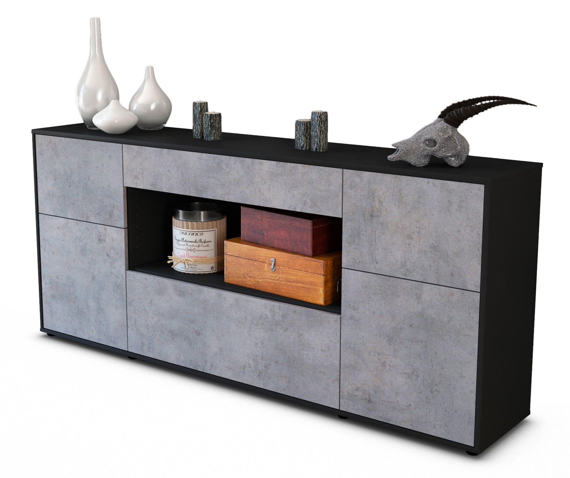 Dieses Sideboard hat Gesamt-Maße von 180x79x35cm. Viel Platz, eine leere Wand, kein passendes Möbelstück? Unsere 1,80 m lange Kommode ist die perfekte Lösung! Die Frontfarbe Beton wirkt zeitlos und hoch modern. Die steinähnliche Nachbildung zeigt sich als klassisch, stilvolles Grau meliert. Die Betonoptik im Industrie-Look liegt gerade voll im Trend. Der anthrazit-matte Korpus harmoniert mit allen Farben und wirkt besonders edel im Kontrast zu hellen Wänden.