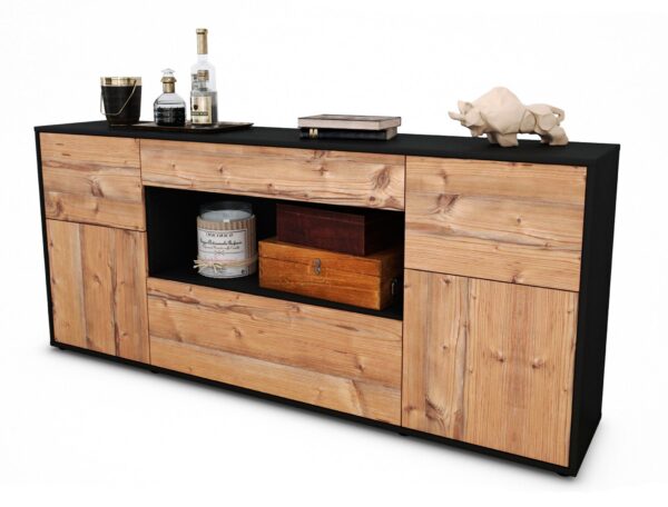 Dieses Sideboard hat Gesamt-Maße von 180x79x35cm. Viel Platz, eine leere Wand, kein passendes Möbelstück? Unsere 1,80 m lange Kommode ist die perfekte Lösung! Die Holz Front Pinie Nachbildung ist ein freundliches Braun mit farblich abgesetzter Holzmaserung. Die Integrierung in Wohnräume ist durch das warme Holz leicht möglich. Der anthrazit-matte Korpus harmoniert mit allen Farben und wirkt besonders edel im Kontrast zu hellen Wänden.