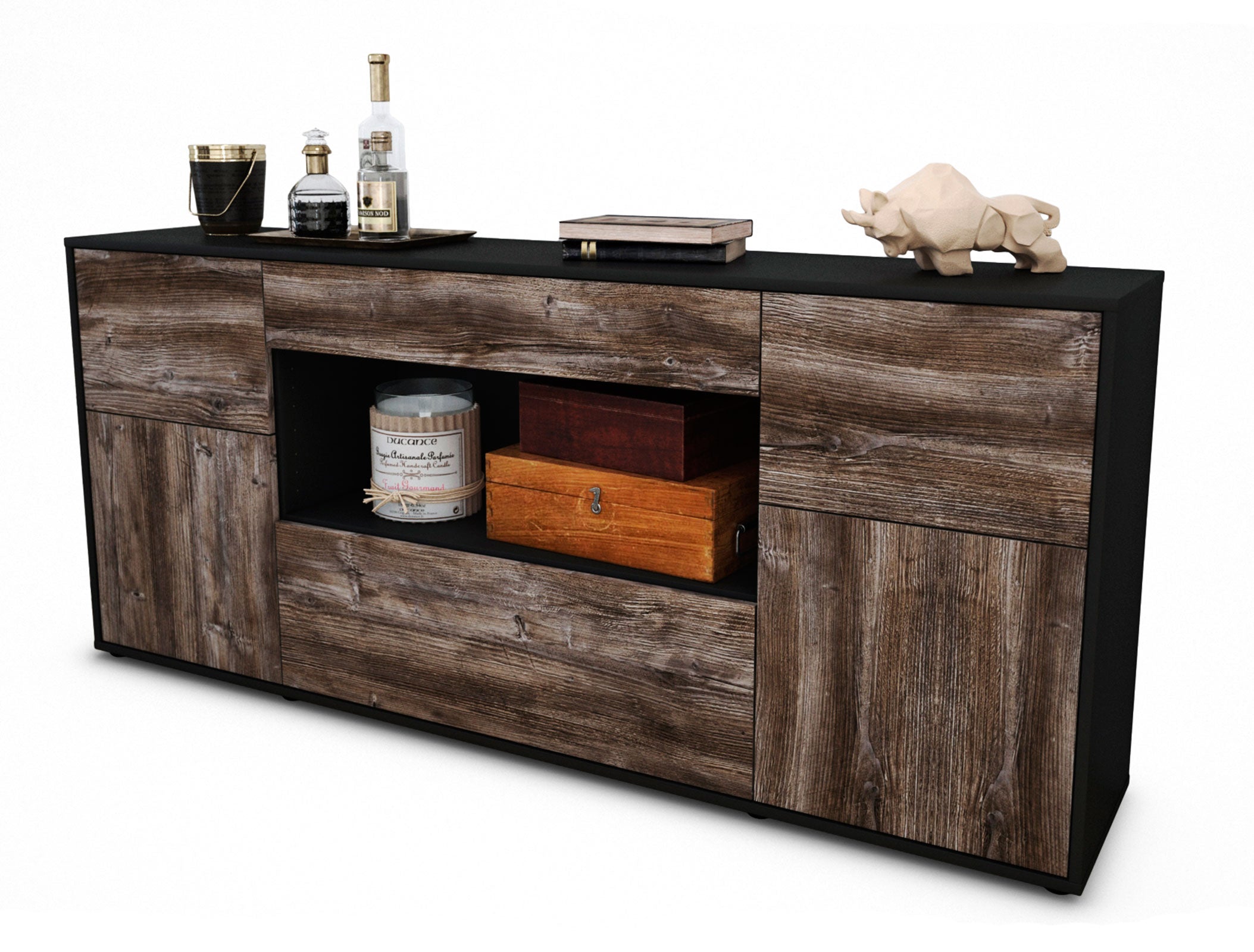 Dieses Sideboard hat Gesamt-Maße von 180x79x35cm. Viel Platz, eine leere Wand, kein passendes Möbelstück? Unsere 1,80 m lange Kommode ist die perfekte Lösung! Die Holz Front Treibholz Nachbildung ist ein gemütliches, dunkel grau mit einer schönen abgesetzten Holzmaserung. Das rustikale Holz strahlt Ruhe und Geborgenheit aus. Der anthrazit-matte Korpus harmoniert mit allen Farben und wirkt besonders edel im Kontrast zu hellen Wänden.