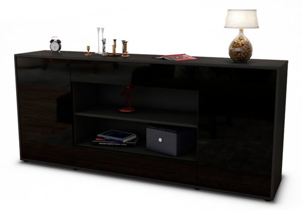 Dieses Sideboard hat Gesamt-Maße von 180x79x35cm. Viel Platz, eine leere Wand, kein passendes Möbelstück? Unsere 1,80 m lange Kommode ist die perfekte Lösung! Die Frontfarbe Hochglanz Schwarz ist eine der beliebtesten Möbelfarben. Glanz Dekore sind hoch modern und liegen immer im Trend. Die Front ist glänzend und und leicht spiegelnd. Der anthrazit-matte Korpus harmoniert mit allen Farben und wirkt besonders edel im Kontrast zu hellen Wänden.