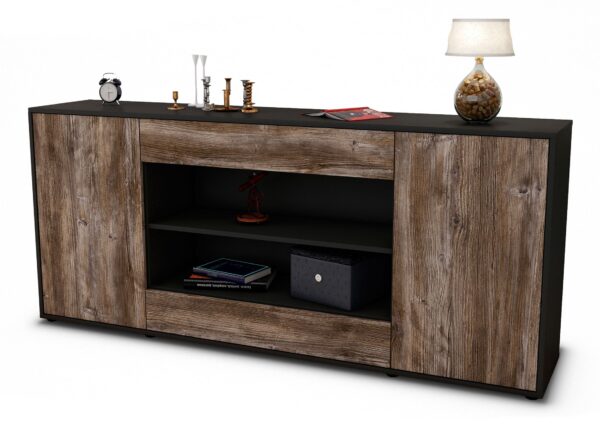Dieses Sideboard hat Gesamt-Maße von 180x79x35cm. Viel Platz, eine leere Wand, kein passendes Möbelstück? Unsere 1,80 m lange Kommode ist die perfekte Lösung! Die Holz Front Treibholz Nachbildung ist ein gemütliches, dunkel grau mit einer schönen abgesetzten Holzmaserung. Das rustikale Holz strahlt Ruhe und Geborgenheit aus. Der anthrazit-matte Korpus harmoniert mit allen Farben und wirkt besonders edel im Kontrast zu hellen Wänden.