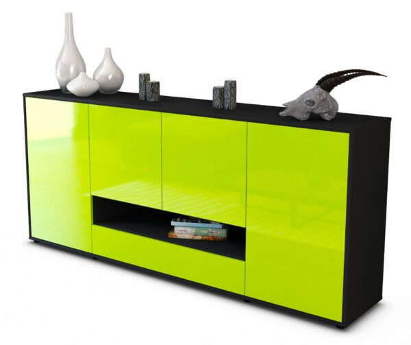 Dieses Sideboard hat Gesamt-Maße von 180x79x35cm. Viel Platz, eine leere Wand, kein passendes Möbelstück? Unsere 1,80 m lange Kommode ist die perfekte Lösung! Die Frontfarbe Hochglanz Limettengrün bringt Schwung, Glanz und Farbe in jede Wohnung. Das knallig, leuchtende grün ist glänzend und wirkt wie ein frisches Apfelgrün oder eine saftige Limette. Der anthrazit-matte Korpus harmoniert mit allen Farben und wirkt besonders edel im Kontrast zu hellen Wänden.