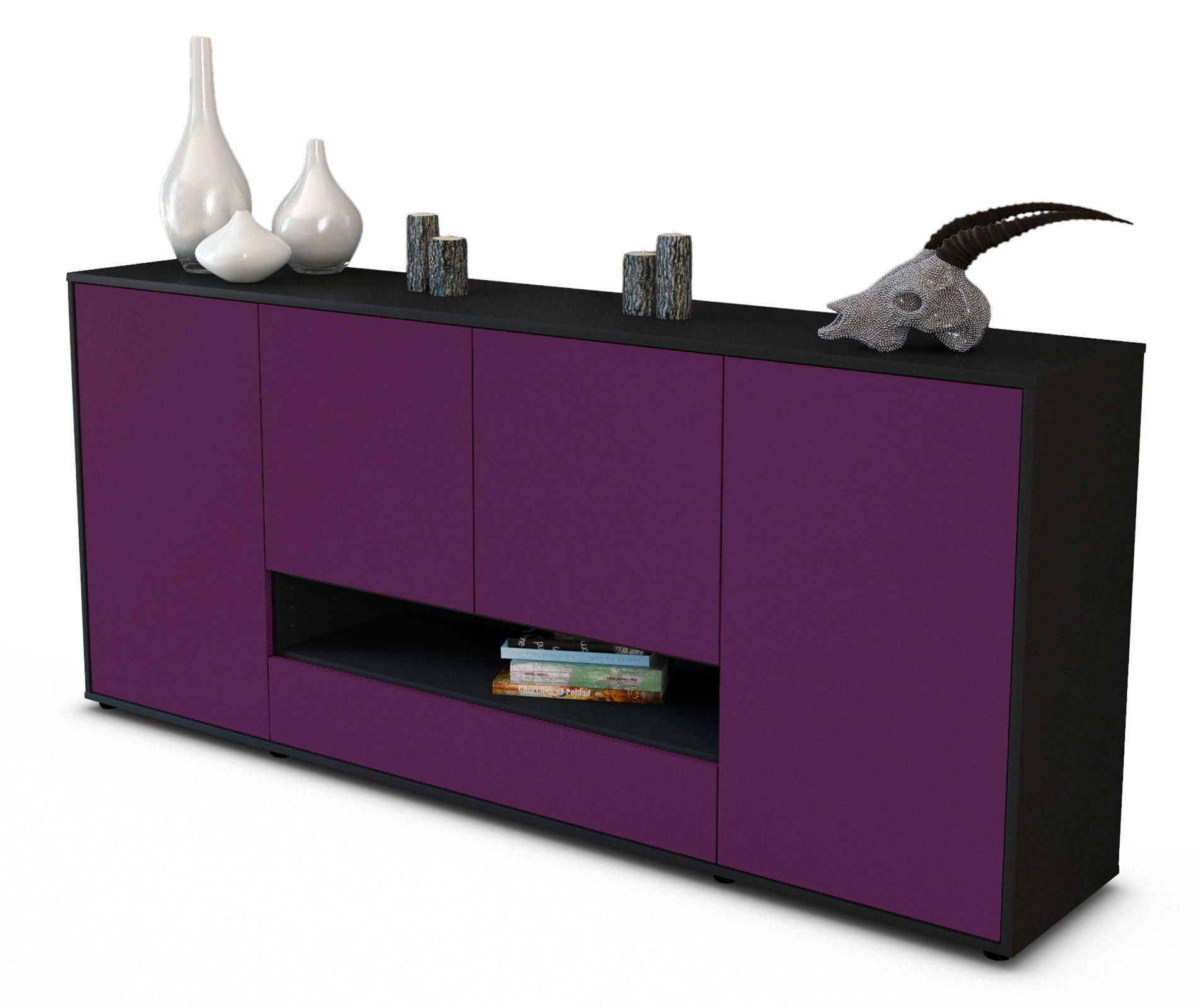 Dieses Sideboard hat Gesamt-Maße von 180x79x35cm. Viel Platz, eine leere Wand, kein passendes Möbelstück? Unsere 1,80 m lange Kommode ist die perfekte Lösung! Die Frontfarbe im kräftigen Aubergine wirkt als Farbtupfer in allen Räumlichkeiten. Lila, violett und Brombeer Töne versprühen Glamour und Eleganz. Der anthrazit-matte Korpus harmoniert mit allen Farben und wirkt besonders edel im Kontrast zu hellen Wänden.