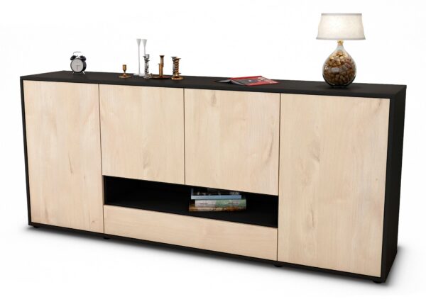 Dieses Sideboard hat Gesamt-Maße von 180x79x35cm. Viel Platz, eine leere Wand, kein passendes Möbelstück? Unsere 1,80 m lange Kommode ist die perfekte Lösung! Die Holz Front Zeder Nachbildung ist ein Holz Dekor welches sehr hell und mit einer dezenten Holzmaserung punktet. Durch das frische Dekor ist der Schrank ideal für alle Räume geeignet. Der anthrazit-matte Korpus harmoniert mit allen Farben und wirkt besonders edel im Kontrast zu hellen Wänden.