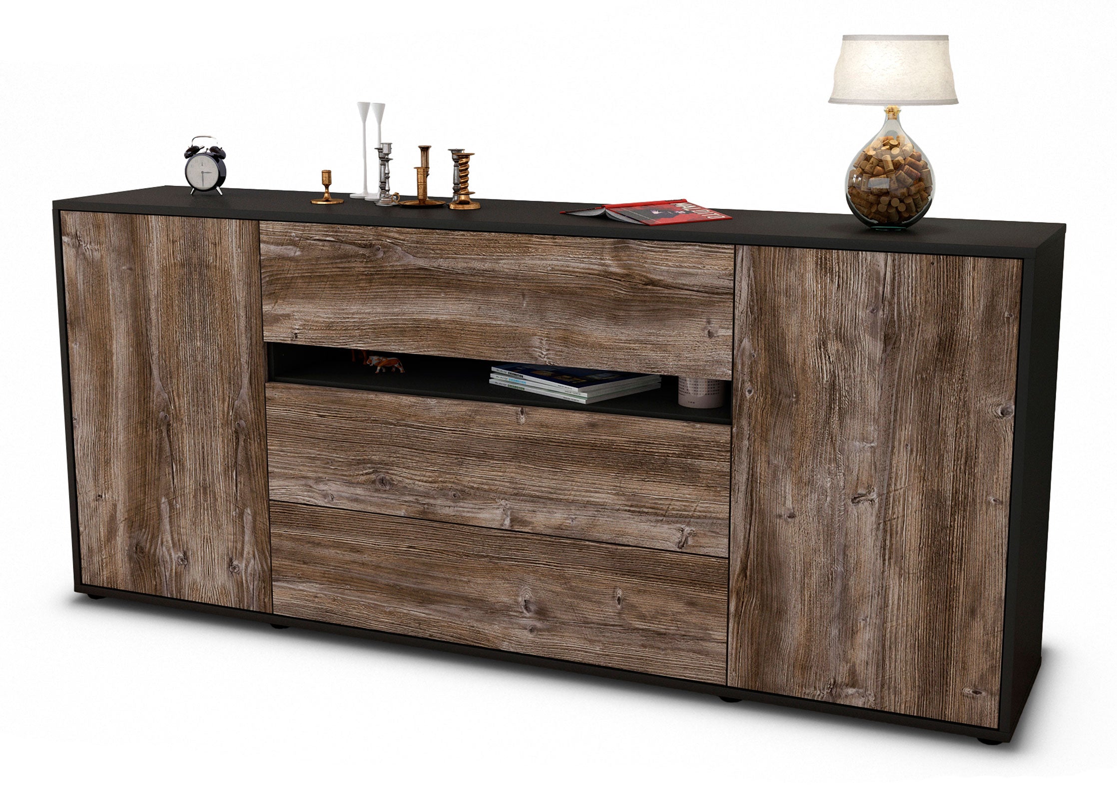 Dieses Sideboard hat Gesamt-Maße von 180x79x35cm. Viel Platz, eine leere Wand, kein passendes Möbelstück? Unsere 1,80 m lange Kommode ist die perfekte Lösung! Die Holz Front Treibholz Nachbildung ist ein gemütliches, dunkel grau mit einer schönen abgesetzten Holzmaserung. Das rustikale Holz strahlt Ruhe und Geborgenheit aus. Der anthrazit-matte Korpus harmoniert mit allen Farben und wirkt besonders edel im Kontrast zu hellen Wänden.
